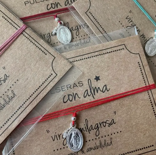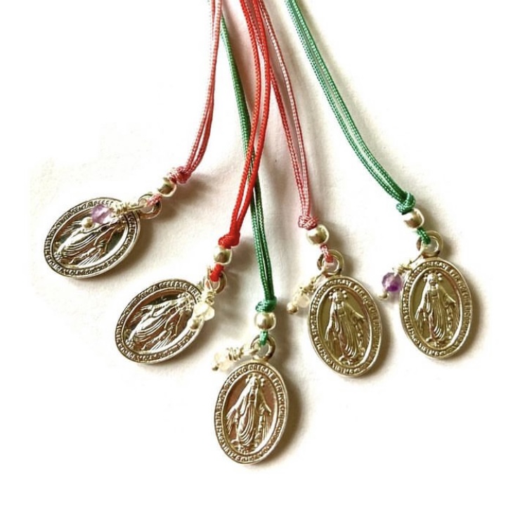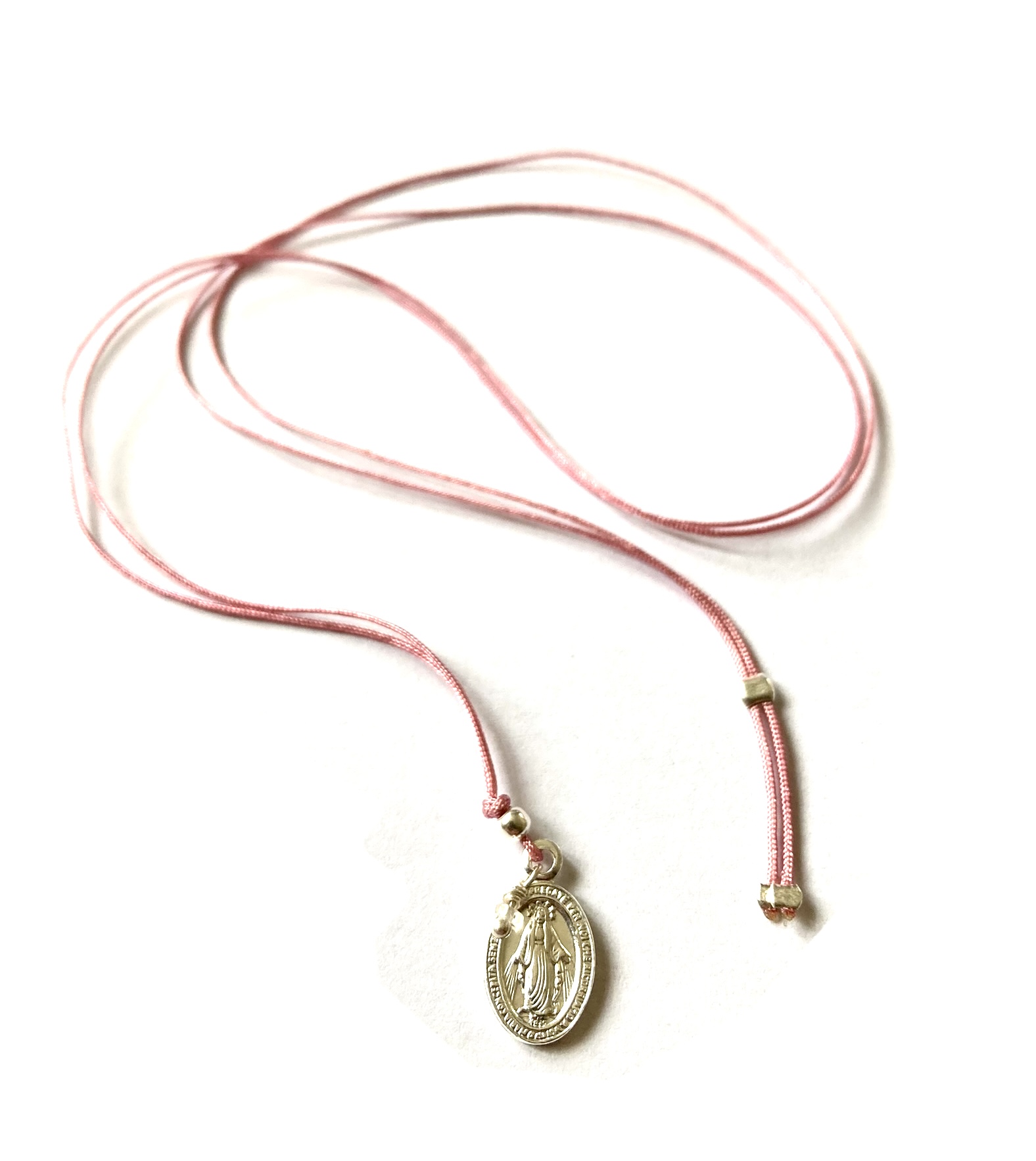 Collar ajustable de hilo, medalla de la Virgen Milagrosa en plata y piedra semipreciosa.